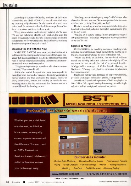 MATCHING MORTAR on a newly repaired section of a building with the existing mortar remains one of the biggest challenges that mason contractors face. Some masons applaud the work of mortar companies for making an extensive line of mortars that will match nearly every color.