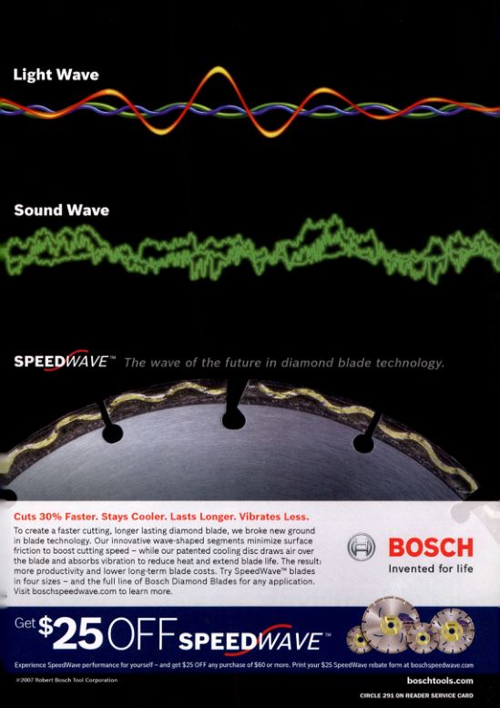 To create a faster cutting, longer lasting diamond blade, we broke new ground in blade technology. Our innovative wave-shaped segments minimize surface friction to boost cutting speed - while our patented cooling disc draws air over the blade and absorbs vibration to reduce heat and extend blade life. The result: more productivity and lower long-term blade costs. Try SpeedWave™ blades in four sizes and the full line of Bosch Diamond Blades for any application. Visit boschspeedwave.com to learn more.