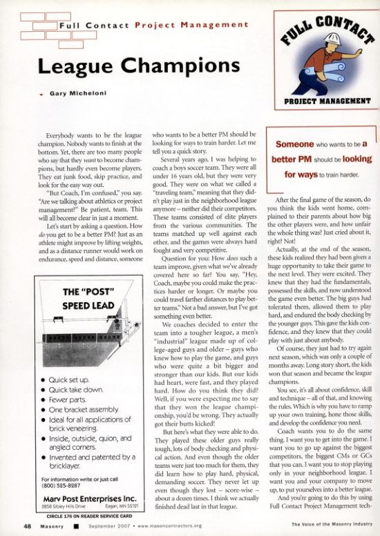Coach wants you to do the same thing. I want you to get into the game. I want you to go up against the biggest competitors, the biggest CMs or GCs that you can. I want you to stop playing only in your neighborhood league. I want you and your company to move up, to put yourselves into a better league.