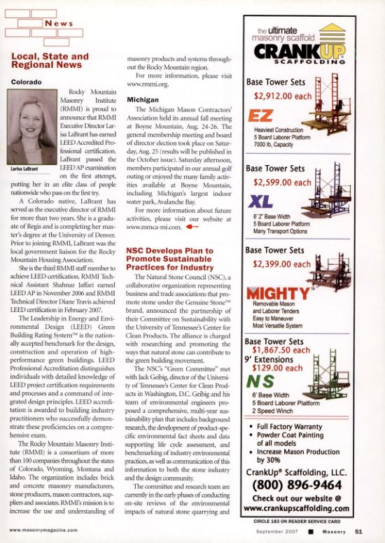 The Rocky Mountain Masonry Institute (RMMI) is proud to announce that RMMI Executive Director Larisa LaBrant has earned LEED Accredited Professional certification. LaBrant passed the LEED AP examination on the first attempt, putting her in an elite class of people nationwide who pass on the first try.