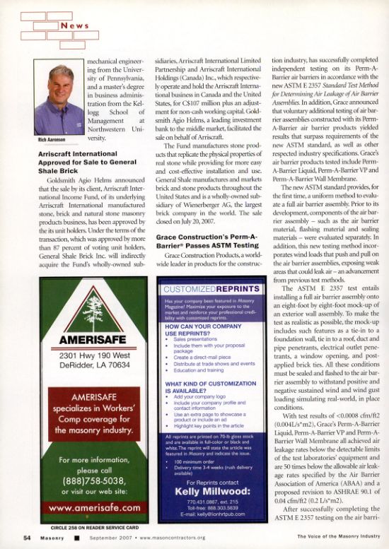 Grace Construction Products, a worldwide leader in products for the construction industry, has successfully completed independent testing on its Perm-A-Barrier air barriers in accordance with the new ASTM E 2357 Standard Test Method for Determining Air Leakage of Air Barrier Assemblies. In addition, Grace announced that voluntary additional testing of air barrier assemblies constructed with its Perm-A-Barrier air barrier products yielded results that surpass requirements of the new ASTM standard, as well as other respected industry specifications. Grace's air barrier products tested include Perm A-Barrier Liquid, Perm-A-Barrier VP and Perm-A-Barrier Wall Membrane.