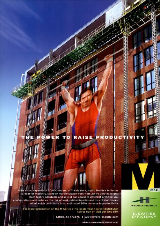 With a load capacity of 20,000 lbs and a 7' wide deck, Hydro Mobile's M-Series is ideal for masonry, stone or marble facade work from 20' to 250' in height.