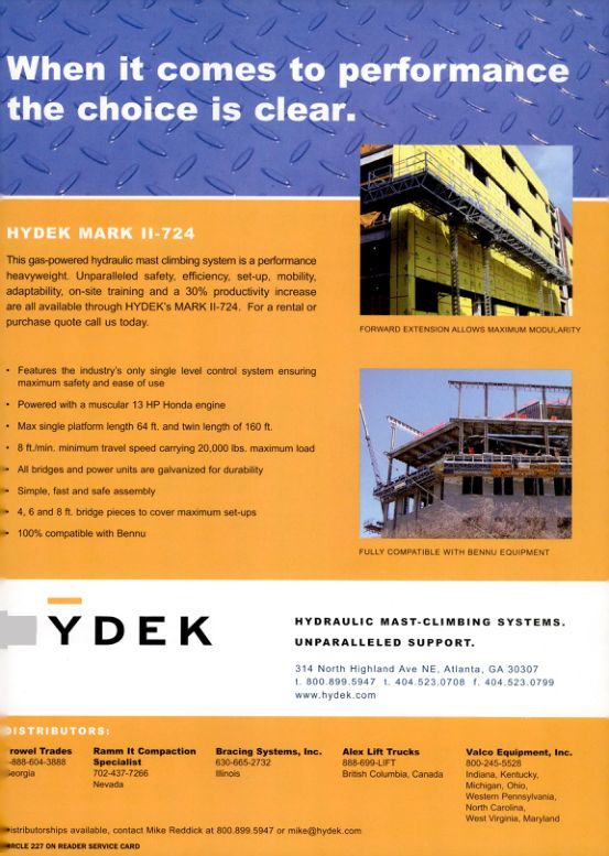 This gas-powered hydraulic mast climbing system is a performance heavyweight. Unparalleled safety, efficiency, set-up, mobility, adaptability, on-site training and a 30% productivity increase are all available through HYDEK's MARK II-724. For a rental or purchase quote call us today.