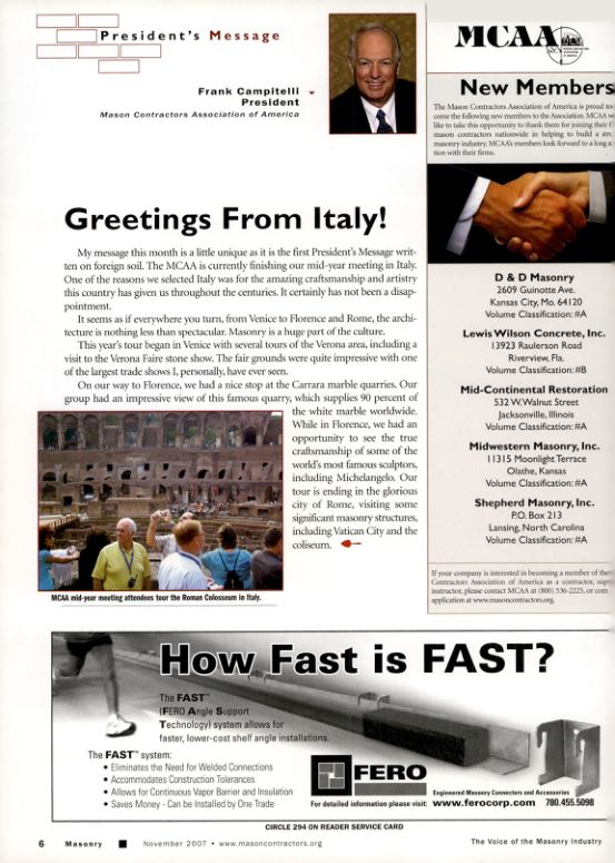 My message this month is a little unique as it is the first President's Message written on foreign soil. The MCAA is currently finishing our mid-year meeting in Italy. One of the reasons we selected Italy was for the amazing craftsmanship and artistry this country has given us throughout the centuries. It certainly has not been a disappointment.