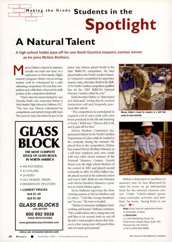 McGee Brothers Contractors Inc. sponsored Hefner in the North Carolina Department of Labor while he worked at the company during the summer. He placed first in the competition. Hefner later joined McGee Brothers Masonry as a full-time employee and, now, works with two other recent winners of the National Masonry Contest. Garrett Hood won the high school division of the contest in 2001 and placed second nationally in 2002. In 2004, Dallas Caudle placed second in the national contest and won it 2005. Both are now foremen with McGee Brothers Masonry, a position to which Hefner aspires.