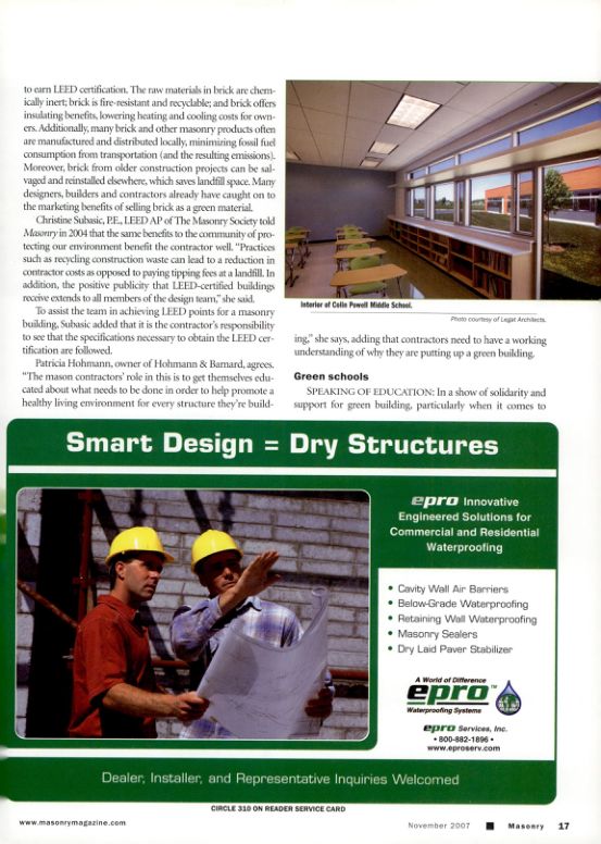 Patricia Hohmann, owner of Hohmann & Barnard, agrees. "The mason contractors' role in this is to get themselves educated about what needs to be done in order to help promote a healthy living environment for every structure they're building," she says, adding that contractors need to have a working understanding of why they are putting up a green building.