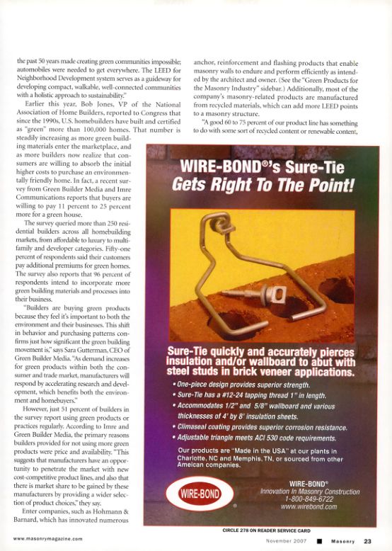 Enter companies, such as Hohmann & Barnard, which has innovated numerous www.masonrymagazine.com anchor, reinforcement and flashing products that enable masonry walls to endure and perform efficiently as intended by the architect and owner. (See the "Green Products for the Masonry Industry" sidebar.) Additionally, most of the company's masonry-related products are manufactured from recycled materials, which can add more LEED points to a masonry structure.