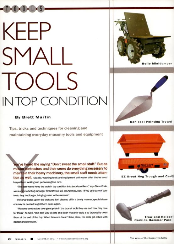 "The best way to keep the tools in top condition is to just clean them," says Steve Cook, sales and marketing manager for Kraft Tool Co. in Shawnee, Kan. "If you take care of your tools, they last longer, bringing value to the masons."