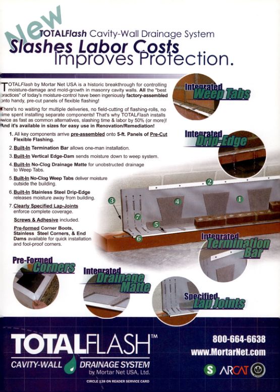 TOTALFlash by Mortar Net USA is a historic breakthrough for controlling moisture-damage and mold-growth in masonry cavity walls. All the "best practices" of today's moisture-control have been ingeniously factory-assembled onto handy, pre-cut panels of flexible flashing!