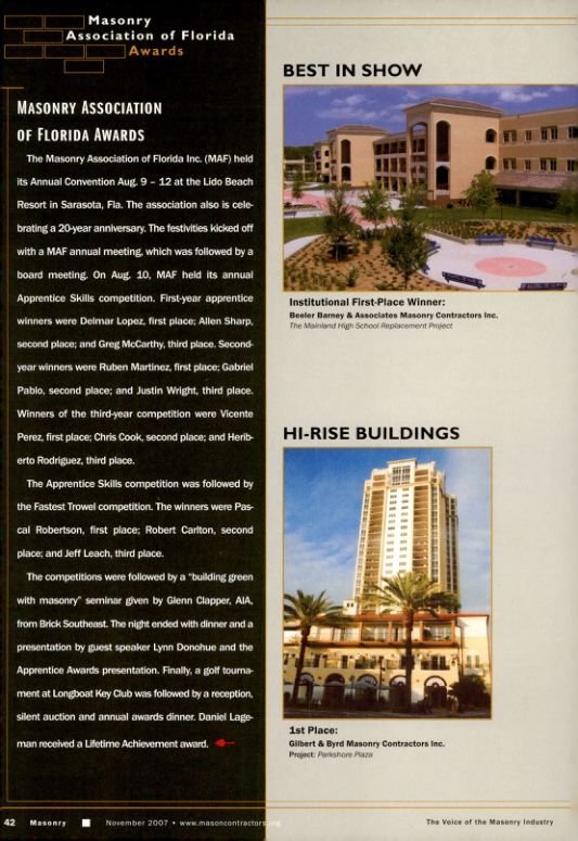 The competitions were followed by a "building green with masonry" seminar given by Glenn Clapper, AIA, from Brick Southeast. The night ended with dinner and a presentation by guest speaker Lynn Donohue and the Apprentice Awards presentation. Finally, a golf tournament at Longboat Key Club was followed by a reception, silent auction and annual awards dinner. Daniel Lageman received a Lifetime Achievement award.