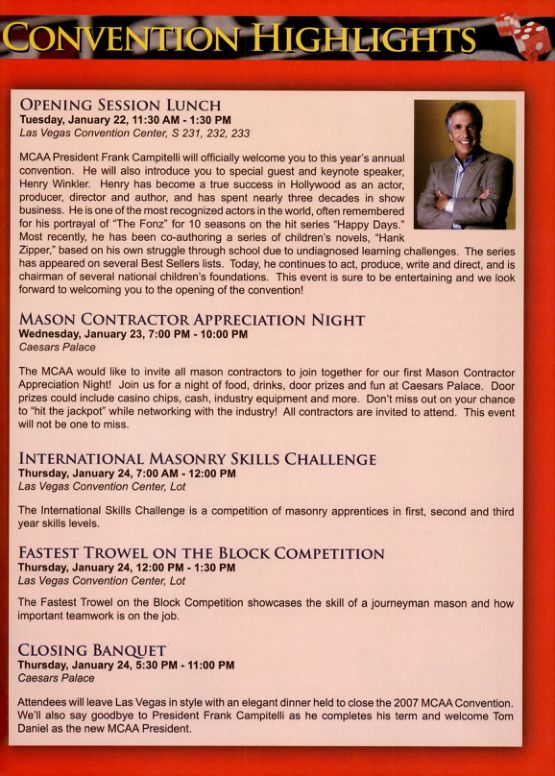MCAA President Frank Campitelli will officially welcome you to this year's annual convention. He will also introduce you to special guest and keynote speaker, Henry Winkler. Henry has become a true success in Hollywood as an actor, producer, director and author, and has spent nearly three decades in show business. He is one of the most recognized actors in the world, often remembered for his portrayal of "The Fonz" for 10 seasons on the hit series "Happy Days." Most recently, he has been co-authoring a series of children's novels, "Hank Zipper," based on his own struggle through school due to undiagnosed learning challenges. The series has appeared on several Best Sellers lists. Today, he continues to act, produce, write and direct, and is chairman of several national children's foundations. This event is sure to be entertaining and we look forward to welcoming you to the opening of the convention!