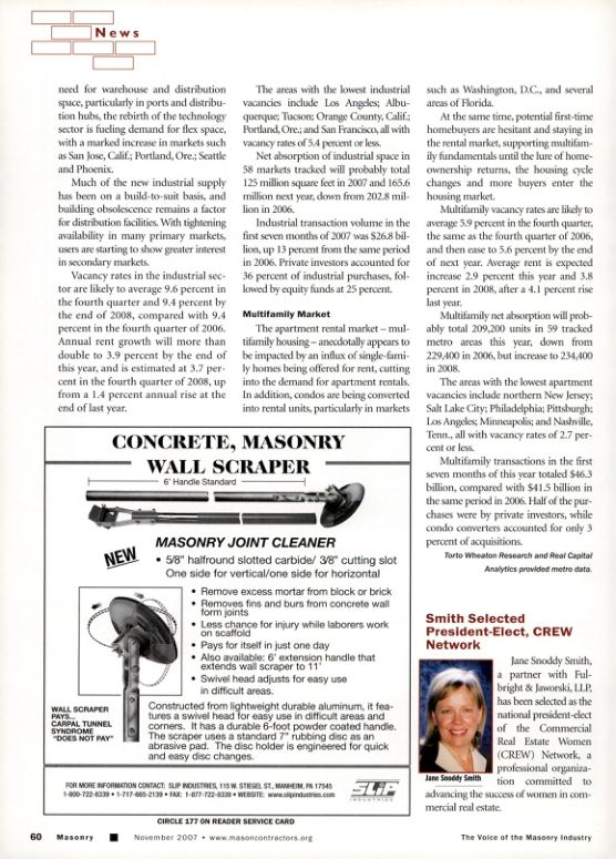 Jane Snoddy Smith, a partner with Fulbright & Jaworski, LLP, has been selected as the national president-elect of the Commercial Real Estate Women (CREW) Network, a professional organization committed to advancing the success of women in commercial real estate.