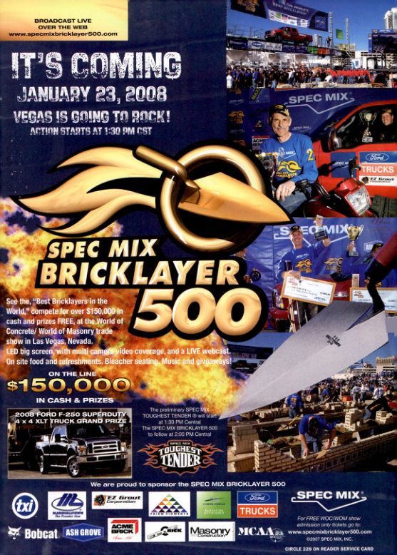 See the, "Best Bricklayers in the World," compete for over $150,000 in cash and prizes FREE, at the World of Concrete/ World of Masonry trade show in Las Vegas, Nevada. LED big screen, with multi camera video coverage, and a LIVE webcast. On site food and refreshments. Bleacher seating. Music and giveaways!