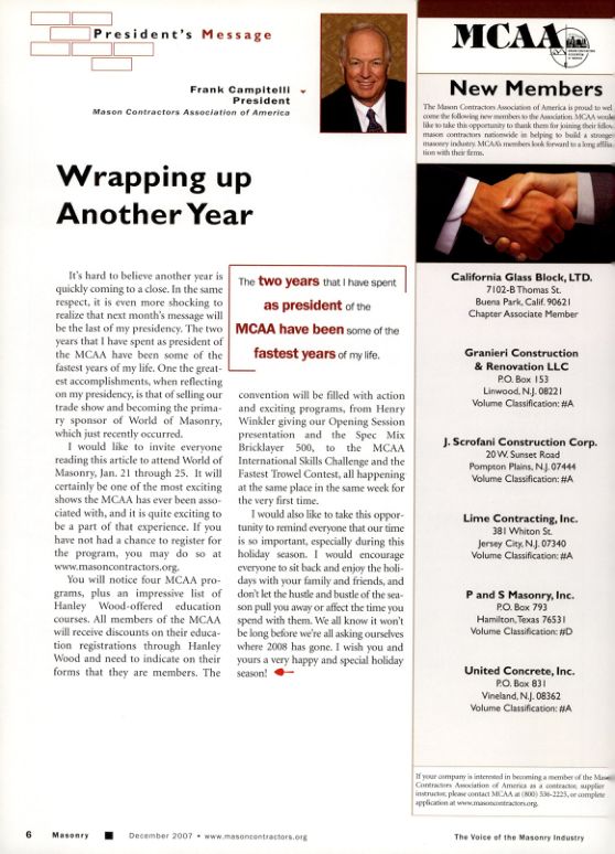 It's hard to believe another year is quickly coming to a close. In the same respect, it is even more shocking to realize that next month's message will be the last of my presidency. The two years that I have spent as president of the MCAA have been some of the fastest years of my life. One the greatest accomplishments, when reflecting on my presidency, is that of selling our trade show and becoming the primary sponsor of World of Masonry, which just recently occurred.