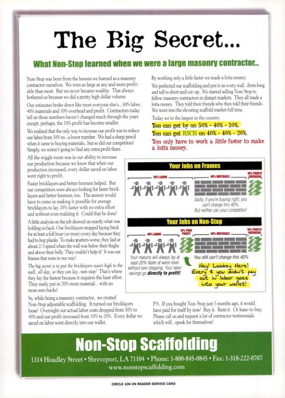 By working only a little faster we made a lotta money. We perfected our scaffolding and put it on every wall...from long and tall to short and cut-up. We started selling Non-Stop to fellow masonry contractors in distant markets. They all made a lotta money. They told their friends who then told their friends. We went into the elevating scaffold market full time.