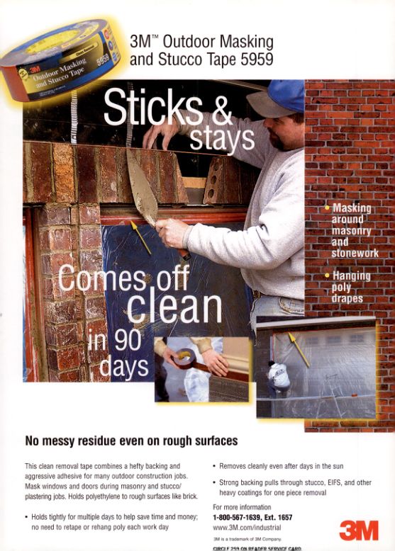 This clean removal tape combines a hefty backing and aggressive adhesive for many outdoor construction jobs. Mask windows and doors during masonry and stucco/plastering jobs. Holds polyethylene to rough surfaces like brick.