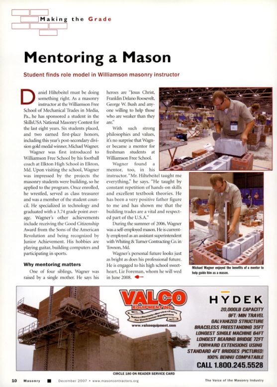 Daniel Hiltebeitel must be doing something right. As a masonry instructor at the Williamson Free School of Mechanical Trades in Media, Pa, he has sponsored a student in the SkillsUSA National Masonry Contest for the last eight years. Six students placed, and two earned first-place honors, including this year's post-secondary division gold medal winner, Michael Wagner.