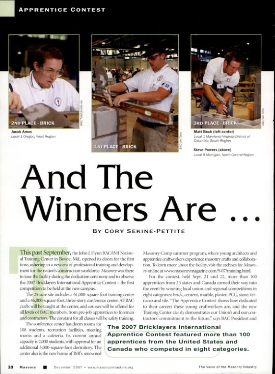 This past September, the John J. Flynn BAC/IMI National Training Center in Bowie, Md., opened its doors for the first time, ushering in a new era of professional training and development for the nation's construction workforce. Masonry was there to tour the facility during the dedication ceremony and to observe the 2007 Bricklayers International Apprentice Contest-the first competition to be held at the new campus.