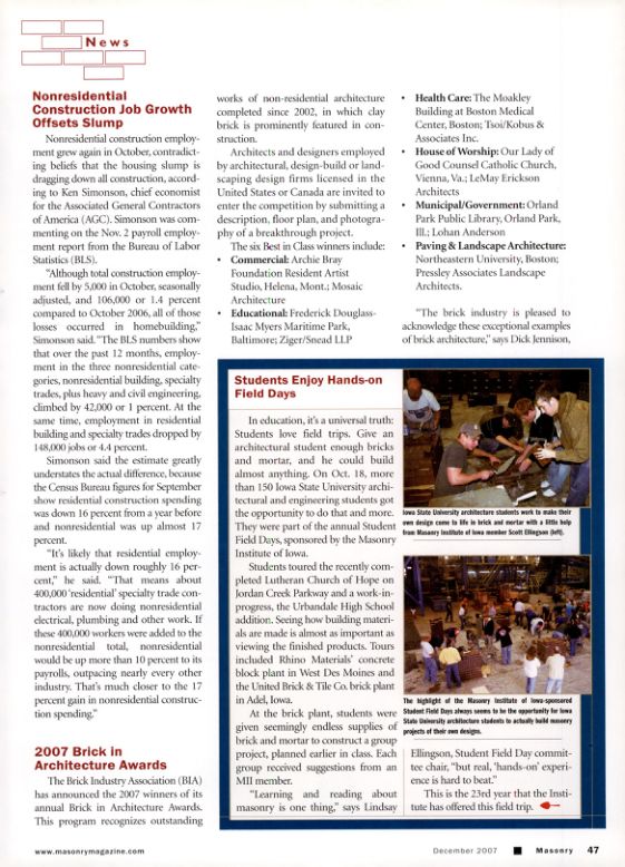 The Brick Industry Association (BIA) has announced the 2007 winners of its annual Brick in Architecture Awards. This program recognizes outstanding works of non-residential architecture completed since 2002, in which clay brick is prominently featured in construction.