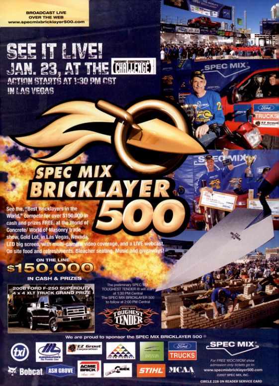 See the, "Best Bricklayers in the World," compete for over $150,000 in cash and prizes FREE, at the World of Concrete/ World of Masonry trade show, Gold Lot, in Las Vegas, Nevada. LED big screen, with multi-camera video coverage, and a LIVE webcast. On site food and refreshments. Bleacher seating, Music and giveaways!