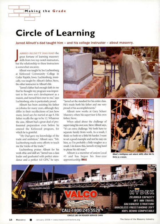 Jarred Allnutt has had the great fortune of learning masonry skills from two top-notch instructors, but the relationship to these instructors is somewhat uncanny.