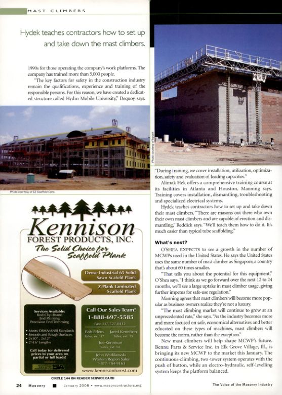 Hydek teaches contractors how to set up and take down their mast climbers. "There are masons out there who own their own mast climbers and are capable of erection and dismantling," Reddick says. "We'll teach them how to do it. It's much easier than typical tube scaffolding."