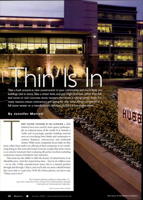 Take a look around at new construction in your community, and you'll likely see buildings clad in stone. Take a closer look, and you might find that, rather than full-bed stone or cast concrete stone veneers, thin stone is taking center stage. For many reasons, mason contractors are opting for thin stone. When compared to a full stone veneer or a manufactured concrete product, it just makes sense.