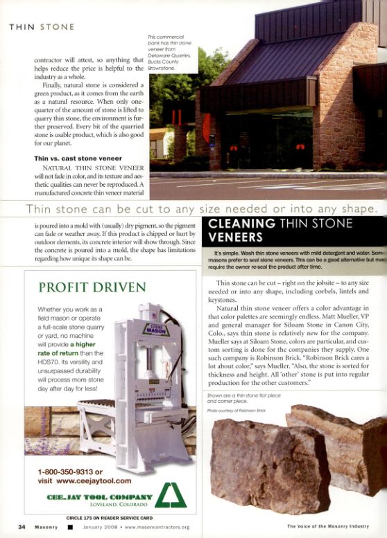 Natural thin stone veneer offers a color advantage in that color palettes are seemingly endless. Matt Mueller, VP and general manager for Siloam Stone in Canon City, Colo., says thin stone is relatively new for the company. Mueller says at Siloam Stone, colors are particular, and custom sorting is done for the companies they supply. One such company is Robinson Brick. "Robinson Brick cares a lot about color," says Mueller. "Also, the stone is sorted for thickness and height. All 'other' stone is put into regular production for the other customers."