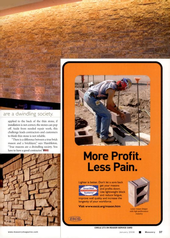 More Profit. Less Pain. Lighter is better. Don't let a sore back get your masons and profits down. Use lightweight block and reduce fatigue, improve wall quality and increase the longevity of your workforce. Visit www.escsi.org/mason.htm. Lower mason fatigue with high performance masonry. www.masonrymagazine.com ESCSI