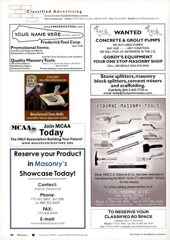 Reserve your Product in Masonry's Showcase Today! Contact: Marvin Diamond Phone: 770.431.0867, ext.208. or 888.303.5639 FAX: 770.432.6969 E-mail: marvin@lionhrtpub.com