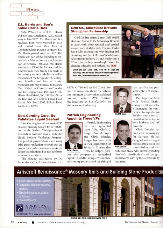 Sallie Wilson Harris of E.L. Harris and Son Inc. Charleston, W.V., passed away in late-2007. Ms. Harris and her husband, Evan, were married in 1935 and resided most their lives in Charleston, later moving to Stuart, Fla. Mr. Harris passed away in 1992. The couple was part of the founding members of the Mason Contractors Association of America (MCAA). Mr. Harris was the first VP of the MCAA, and the contributions their family has made to the industry are great. Ms. Harris will be remembered for her quick wit, selflessness, humility and love of family. Memorial gifts may be made to Hospice Care of the Low Country, c/o Foundation for Hospice Care, P.O. Box 24158, Hilton Head Island, S.C. 29926-4158, or the Boys and Girls Club of Hilton Head Island, P.O. Box 22267, Hilton Head Island, S.C. 29925.