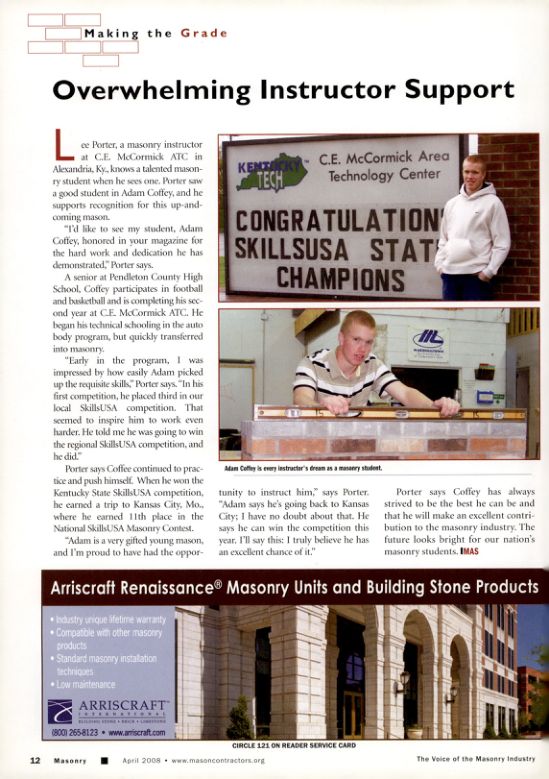 Lee Porter, a masonry instructor at C.E. McCormick ATC in Alexandria, Ky, knows a talented masonry student when he sees one. Porter saw a good student in Adam Coffey, and he supports recognition for this up-and-coming mason.