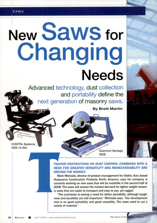 Mark Michaels, director of product management for Olathe, Kan.-based Husqvarna Construction Products North America, says his company is currently working on new saws that will be available in the second half of 2008. The saws will answer the market demand for lighter weight masonry saws that are easier to transport and easy to use, yet rugged.