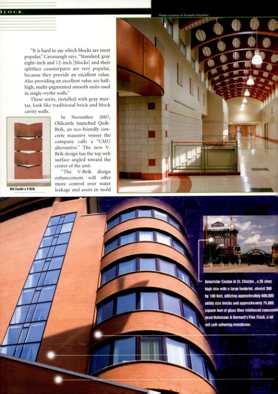 Ameristar Casino in St. Charles, a 25 story high rise with a large footprint, almost 300 by 100 feet, utilizing approximately 600,000 utility size bricks and approximately 75,000 square feet of glass fiber reinforced concret used Hohmann & Barnard's Flex Flash, a 40 mil self-adhering membrane.