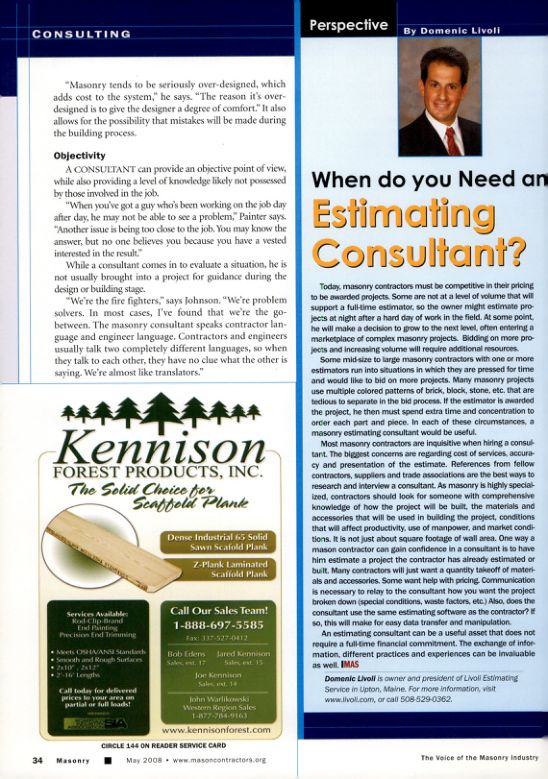 Some mid-size to large masonry contractors with one or more estimators run into situations in which they are pressed for time and would like to bid on more projects. Many masonry projects use multiple colored patterns of brick, block, stone, etc. that are tedious to separate in the bid process. If the estimator is awarded the project, he then must spend extra time and concentration to order each part and piece. In each of these circumstances, a masonry estimating consultant would be useful.