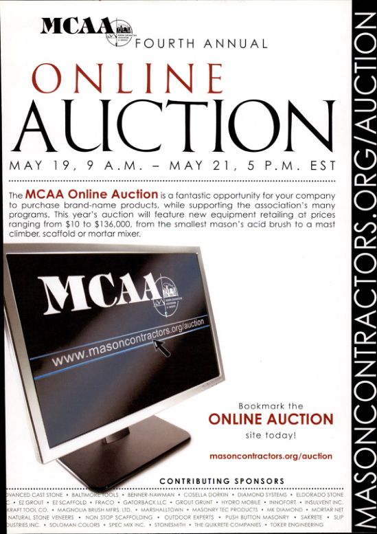 The MCAA Online Auction is a fantastic opportunity for your company to purchase brand-name products, while supporting the association's many programs. This year's auction will feature new equipment retailing at prices ranging from $10 to $136,000, from the smallest mason's acid brush to a mast climber, scaffold or mortar mixer.