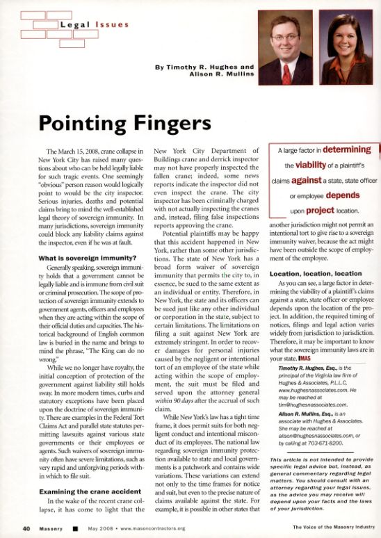 The March 15, 2008, crane collapse in New York City has raised many questions about who can be held legally liable for such tragic events. One seemingly "obvious" person reason would logically point to would be the city inspector. Serious injuries, deaths and potential claims bring to mind the well-established legal theory of sovereign immunity. In many jurisdictions, sovereign immunity could block any liability claims against the inspector, even if he was at fault.