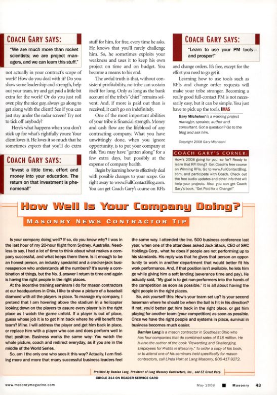 How's 2008 going for you, so far? Ready to learn that RFI thing? Get Coach's free course on Winning RFIs. Go to www.FullContactBlog com, and participate with Coach, Check out the free audio updates and other info that will help your projects. Also, you can get Coach Gary's book, "Get Paid for a Change!"