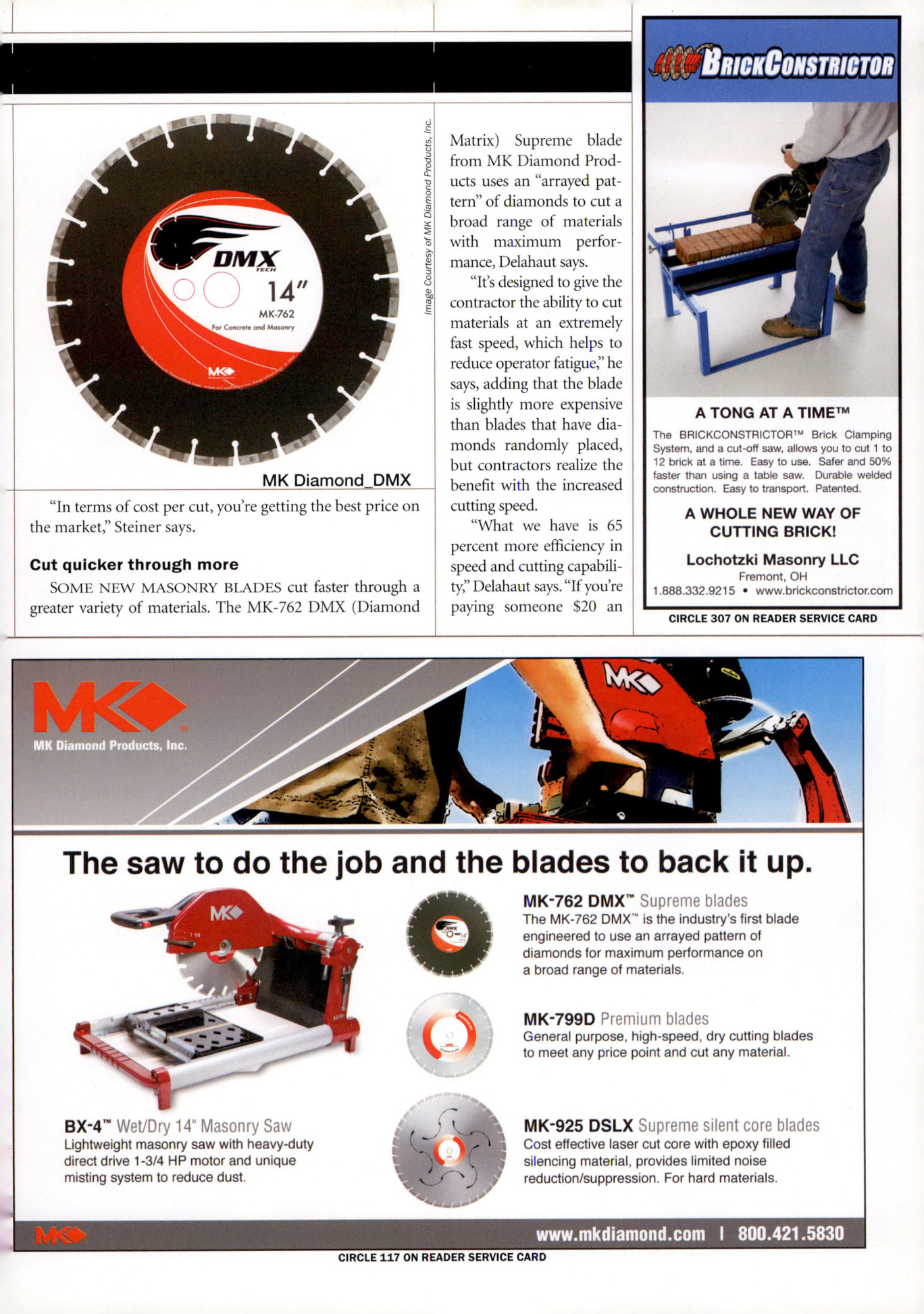The MK-762 DMX (Diamond Matrix) Supreme blade from MK Diamond Products uses an "arrayed pattern" of diamonds to cut a broad range of materials with maximum performance, Delahaut says. "It's designed to give the contractor the ability to cut materials at an extremely fast speed, which helps to reduce operator fatigue," he says, adding that the blade is slightly more expensive than blades that have diamonds randomly placed, but contractors realize the benefit with the increased cutting speed. "What we have is 65 percent more efficiency in speed and cutting capability," Delahaut says. "If you're paying someone $20 an hour, and you can cut 65 percent faster, that's a huge savings." "In terms of cost per cut, you're getting the best price on the market," Steiner says. SOME NEW MASONRY BLADES cut faster through a greater variety of materials.