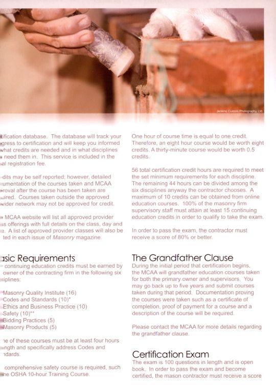 The exam is 100 questions in length and is open book. In order to pass the exam and become certified, the mason contractor must receive a score