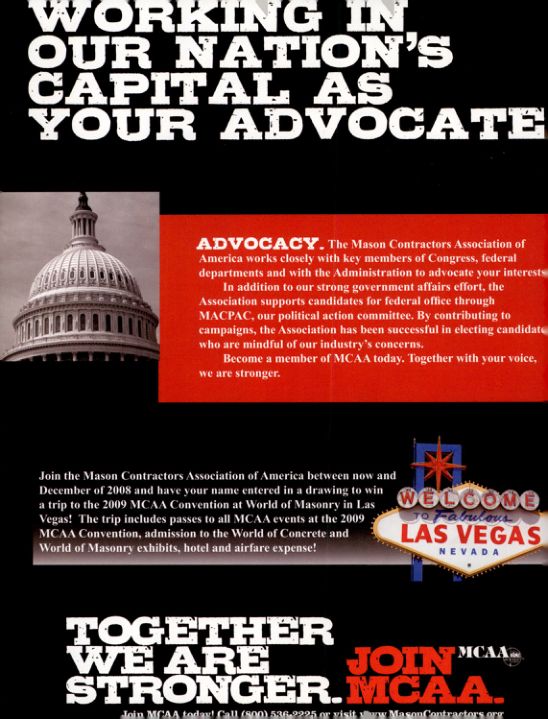 Join the Mason Contractors Association of America between now and December of 2008 and have your name entered in a drawing to win a trip to the 2009 MCAA Convention at World of Masonry in Las Vegas! The trip includes passes to all MCAA events at the 2009 MCAA Convention, admission to the World of Concrete and World of Masonry exhibits, hotel and airfare expense!
