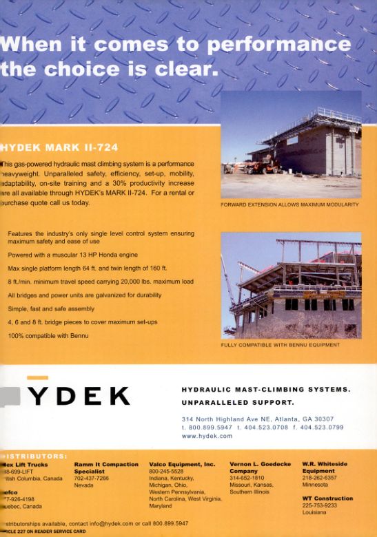 This gas-powered hydraulic mast climbing system is a performance heavyweight. Unparalleled safety, efficiency, set-up, mobility, adaptability, on-site training and a 30% productivity increase are all available through HYDEK's MARK II-724. For a rental or purchase quote call us today.