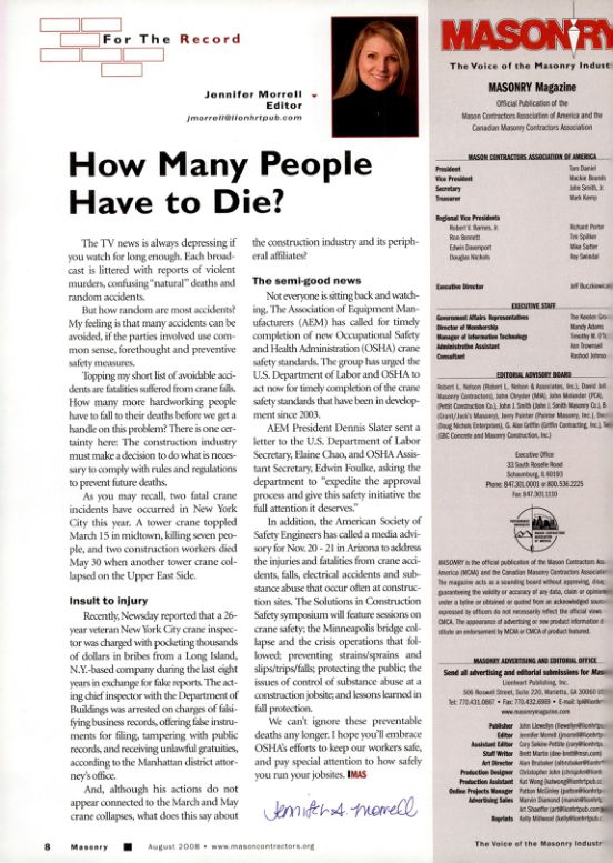 Topping my short list of avoidable accidents are fatalities suffered from crane falls. How many more hardworking people have to fall to their deaths before we get a handle on this problem? There is one certainty here: The construction industry must make a decision to do what is necessary to comply with rules and regulations to prevent future deaths.