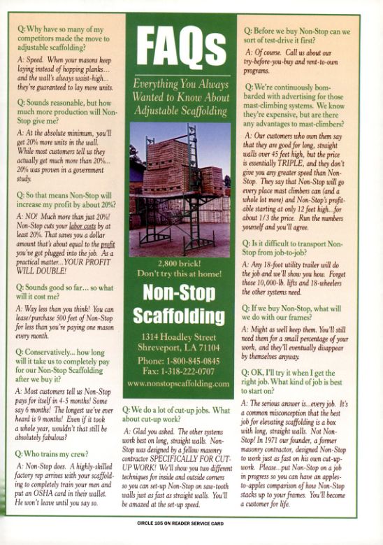 A: Non-Stop does. A highly-skilled factory rep arrives with your scaffolding to completely train your men and put an OSHA card in their wallet. He won't leave until you say so.