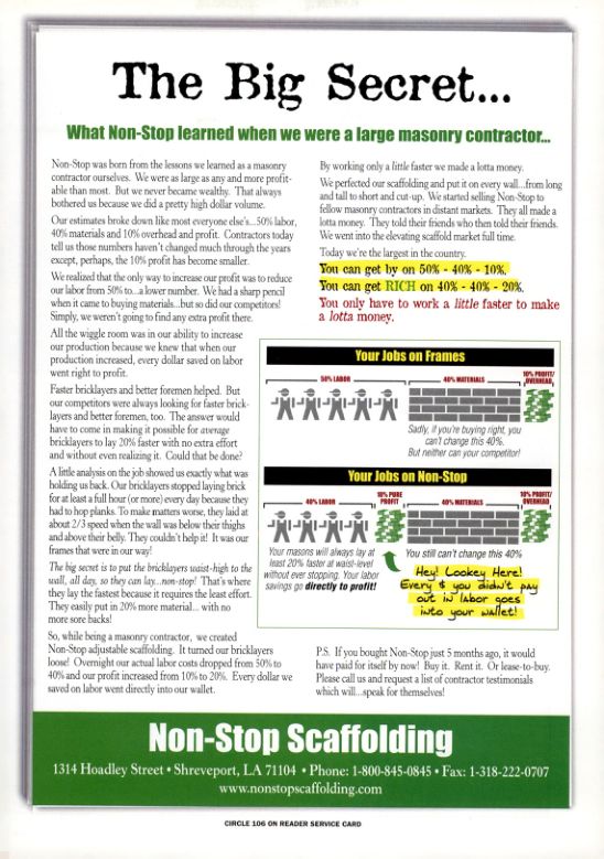 So, while being a masonry contractor, we created Non-Stop adjustable scaffolding. It turned our bricklayers loose! Overnight our actual labor costs dropped from 50% to 40% and our profit increased from 10% to 20%. Every dollar we saved on labor went directly into our wallet.