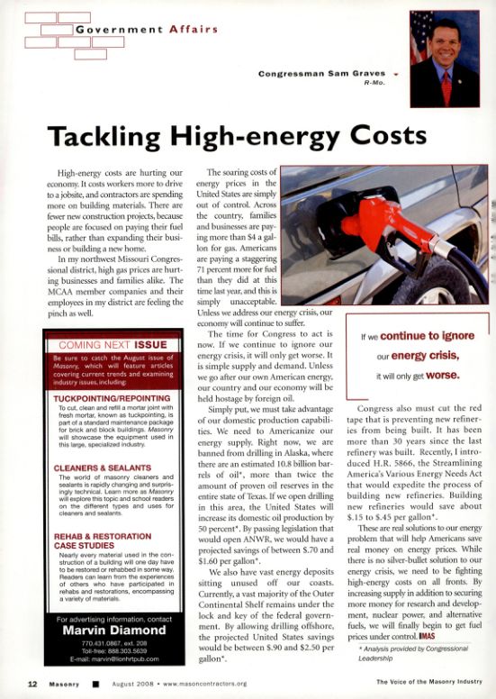 In my northwest Missouri Congressional district, high gas prices are hurting businesses and families alike. The MCAA member companies and their employees in my district are feeling the pinch as well.