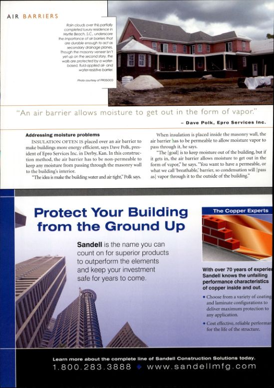 When insulation is placed inside the masonry wall, the air barrier has to be permeable to allow moisture vapor to pass through it, he says. "The [goal] is to keep moisture out of the building, but if it gets in, the air barrier allows moisture to get out in the form of vapor," he says. "You want to have a permeable, or what we call 'breathable, barrier, so condensation will [pass as) vapor through it to the outside of the building."