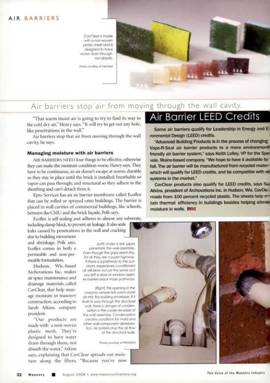 CavClear products also qualify for LEED credits, says Sa Atkins, president of Archovations Inc. in Hudson, Wis. CavCle made from 100 percent recycled plastic. The sheets help m tain thermal efficiency in buildings besides helping elimi moisture in walls. IMAS The Voice of the Masonry Industry