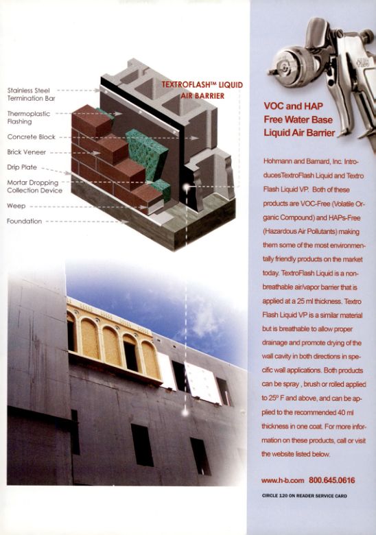 Hohmann and Bamard, Inc. introduces TextroFlash Liquid and Textro Flash Liquid VP. Both of these products are VOC-Free (Volatile Organic Compound) and HAPs-Free (Hazardous Air Pollutants) making them some of the most environmentally friendly products on the market today. TextroFlash Liquid is a non-breathable air/vapor barrier that is applied at a 25 ml thickness. Textro Flash Liquid VP is a similar material but is breathable to allow proper drainage and promote drying of the wall cavity in both directions in specific wall applications. Both products can be spray, brush or rolled applied to 25° F and above, and can be applied to the recommended 40 ml thickness in one coat. For more information on these products, call or visit the website listed below.