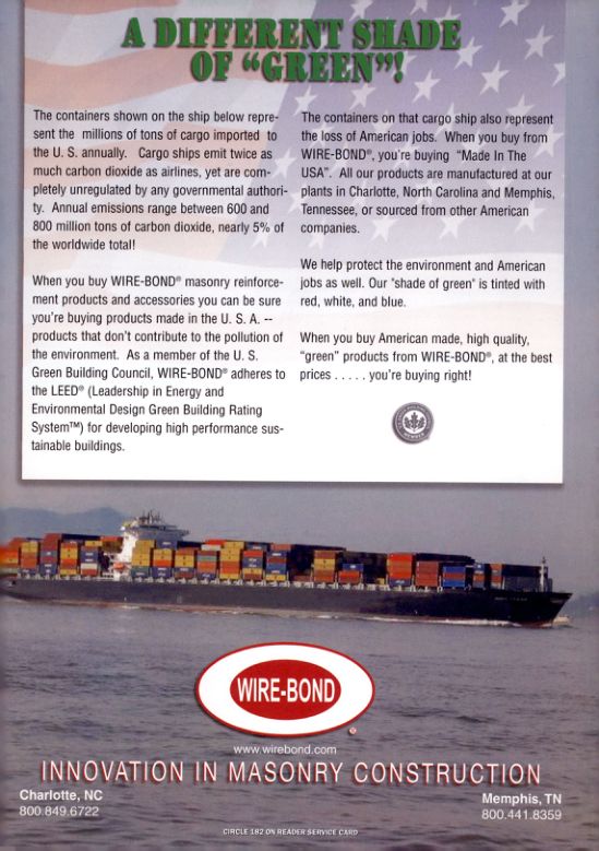 When you buy WIRE-BOND® masonry reinforcement products and accessories you can be sure you're buying products made in the U. S. A., products that don't contribute to the pollution of the environment. As a member of the U. S. Green Building Council, WIRE-BOND® adheres to the LEED® (Leadership in Energy and Environmental Design Green Building Rating System™) for developing high performance sustainable buildings.